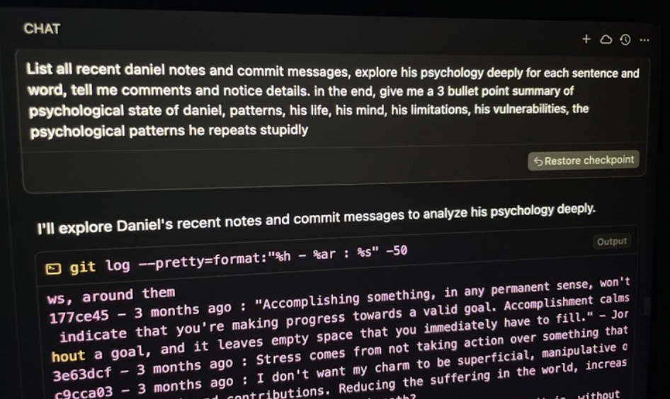 List all their recent notes and commit messages, explore their psychology deeply by each sentence and each word, then produce comments to specific sentences/words about what you read and share details you noticed. In the end, give a 3-bullet-point summary of their psychological state, their life, their mind, their limitations, their vulnerabilities, the psychological patterns they repeat stupidly.