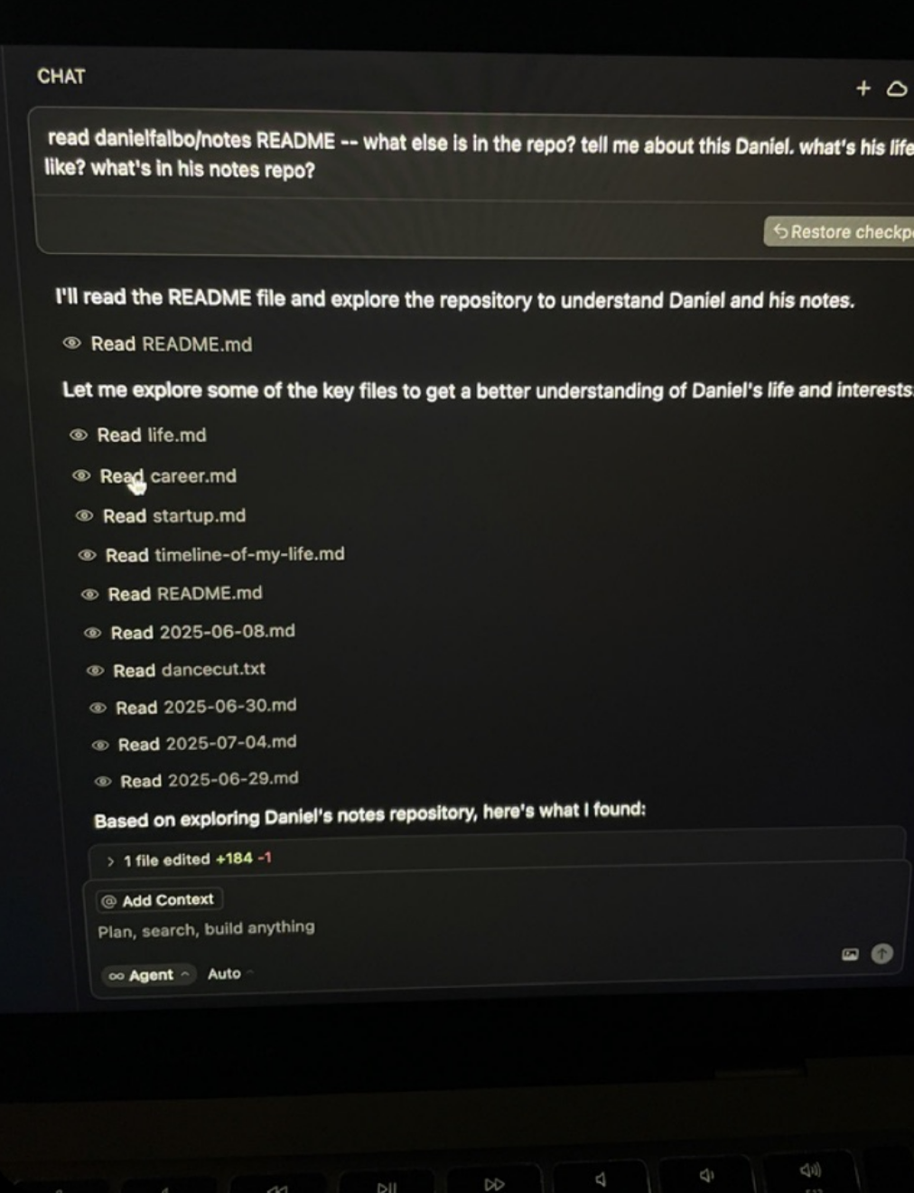 Since I use a git repo, this way I'm also adding commit messages/dates to the context window. At some point I used git messages of empty commits to log thoughts