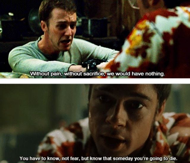 The other day I rewatched Fight Club5 for the nth time, and I love the philosophy behind that movie more every time I rewatch it! I think it's my favorite movie ever.